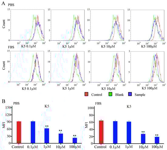 Flow cytometry analysis of inhibitory effect of K5 on S1 protein–ACE2 interaction. (A) FACS analysis of inhibitory effect of K5 on S1 protein–ACE2 interaction in PBS and FBS solution. (B) MFI analysis of inhibitory effect of K5 on S1 protein–ACE2 interaction in PBS and FBS solution. “**” represents a significant difference.
