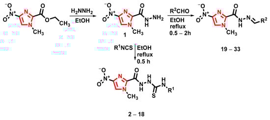 The synthetic route of thiosemicarbazide derivatives (2–18) and hydrazide-hydrazone derivatives (19–33).