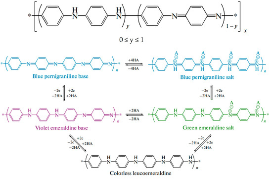 The polymer redox state is determined by the value of y (0 ≤ y ≤ 1), which varies from zero to one (Figure 1). At y = 0.5, polyaniline is in the form of emeraldine; y = 0 corresponds to pernigraniline, the fully oxidized form, while y = 1 corresponds to the fully reduced form, leucoemeraldine [28,29]. Pernigraniline and emeraldine may occur as either salts or bases.