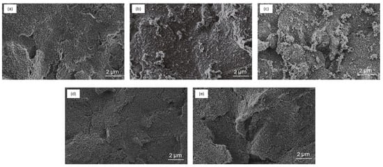 SEM images of (a) carbon bare SPE; (b) electrodeposited PANI on carbon SPE; (c) Au on top of electrodeposited PANI on carbon SPE; (d) PANI/C bare SPE; (e) Au on top of commercial PANI/C SPE.