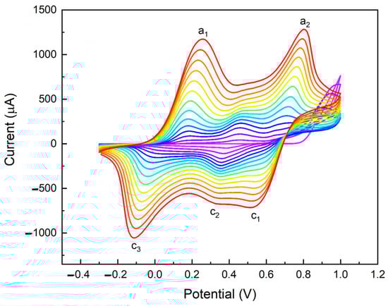 The voltammograms in Figure 3 show the typical PANI oxidation (a1 = 0.24 V and a2 = 0.81 V vs. Ag) and reduction (c1 = 0.52 V, c2 = 0.30 V, and c3 = −0.1 V vs. Ag) peaks [35,36,37]. In the first few cycles of the electropolymerization, the voltammogram shows a PANI oxidation peak at a potential of 0.97 V vs. Ag which is masked by the emeraldine oxidation peak (a2 = 0.81 V vs. Ag) [30] after more deposition cycles. In detail, peak a1 represents the oxidation of leucoemeraldine to emeraldine, and a2 the oxidation of emeraldine to pernigraniline. The peaks c1 and c2 are relative to the reduction of pernigraniline to emeraldine, and the peak c3 is the reduction of emeraldine to leucoemeraldine [28,30,36,37].