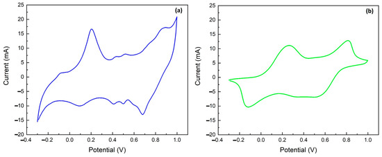 PANI undergoes redox and protonation reactions during a voltage scan; hence, chronoamperometry (CA) was used as a detection method. Amperometry measures the current generated when a constant potential is applied to the working electrode. The applied voltage causes an oxidation (or reduction) reaction on the electrode surface and the corresponding anodic (or cathodic) current is recorded and correlated with the concentration of the target molecule. To obtain the oxidation (or reduction) potential of the analyte under test, cyclic voltammetry must be performed [24,45,46]. Figure 4 shows the voltammograms for the Au/PANI/C (a) and Au/PANIep/C (b) electrodes.