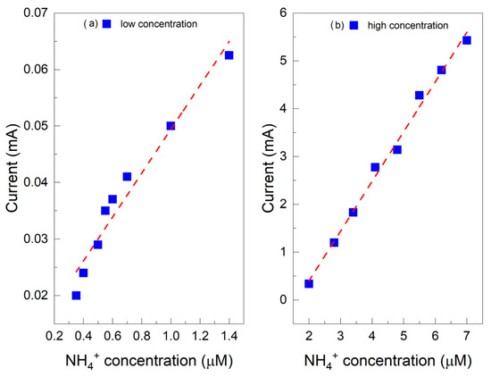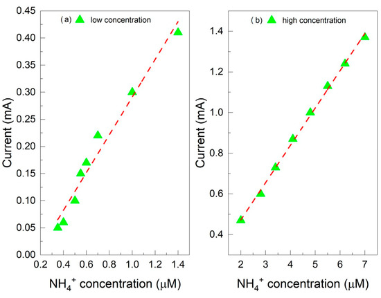 Calibration curves for NH4+ detection for Au/PANIep/C sensor: (a) low concentration, from 0.35 µM to 1.5 µM; (b) high concentration, from 2 µM to 7 µM. The red dashed lines correspond to linear fit of the data points.