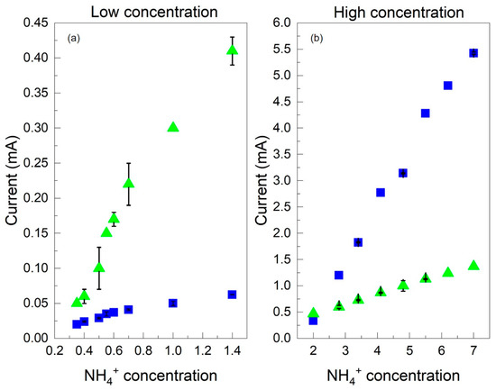 Calibration curves for NH4+ detection for Au/PANIep/C (green triangles) and Au/PANI/C (blue squares) electrodes: (a) low concentration from 0.35 µM to 1.5 µM; (b) high concentration from 2 µM to 7 µM.