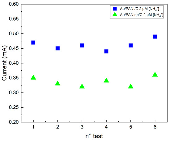 The repeatability test was carried out using the same sensors, Au/PANI/C and Au/PANIep/C, for six consecutive measurements using the same NH4+ solution. A concentration of 2 mM was chosen, above the regime change threshold in the sensitivity of both electrodes. Each electrode was washed with distilled water and wiped with a paper towel between two measurements. The standard deviation (SD) was calculated by comparing the subsequent measurements’ current peak with the first one. Figure 8 shows the amperometric response of sequential injections of 2 µM NH4+ for the Au/PANI/C electrode (blue dots) and the Au/PANIep/C electrode (green squares). After each current stabilization, the sequential injection gave similar maximum oxidation currents (0.47 mA ± 0.02 mA for Au/PANIep/C and 0.35 mA ± 0.02 mA for Au/PANI/C).