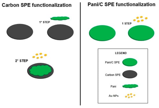 Figure 9 summarizes the functionalization process of two different electrodes: Au on top of the electrodeposited PANIep on the carbon SPE (Au/PANIep/C) and the electrode with Au on top of the PANI/C commercial SPE (Au/PANI/C).