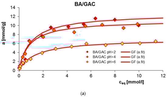 As can be seen, for the three tested adsorption systems (4-NBA/GAC pH = 4; MB/GAC pH = 2; and MB/GAC pH = 7) the inhomogeneity parameters m and n were lower than one, so the full form of the GL equation was used here. In the case of the BA/GAC and 2-, 3-, and 4-NBA/GAC systems at pH = 2, the heterogeneity parameter n is equal to one; therefore, a simplified form of the generalized Langmuir isotherm was used for their analysis—the generalized Freundlich (GF) equations. For the remaining experimental series, the parameter m is equal to one, so the Tóth isotherm equation is the best for their analysis. From a practical point of view, this means that medium heterogeneity effects were observed in the system. The fitted adsorption values were in the ranges of 6.86–11.68 mmol/g, 4.82–6.59 mmol/g, 5.47–9.84 mmol/g, 2.03–3.14 mmol/g, and 0.17–0.29 mmol/g for BA, 2-NBA, 3-NBA, 4-NBA, and MB. These values are very close to the values determined experimentally. The quality of the fit is very good, as evidenced by the high values of the coefficients of determination (R2 = 0.932–0.995) and low values of standard deviations (SD(a) = 0.012–0.096).