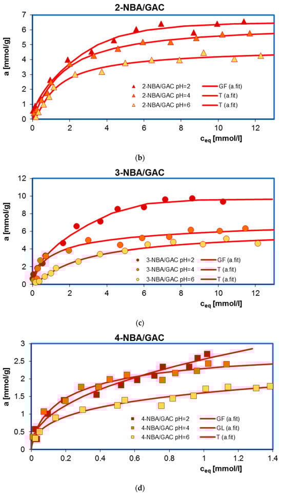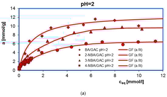 Figure 2 additionally shows a comparison of adsorption isotherms for benzoic acid and its nitro derivatives on activated carbon (GAC) under specific pH conditions. As can be seen, the highest adsorption value was recorded for BA (6.52–11.59 mmol/g), a smaller one for 3-NBA (5.16–9.74 mmol/g), then for 2-NBA (4.26–6.57 mmol/g), and the smallest for 4-NBA (1.77–2.70 mmol/g). This effect can be explained based on differences in the water solubility of the tested adsorbates. The solubility is 2.9 g/L, 6.8 g/L, 3 g/L, and 0.42 g/L for BA, 2-NBA, 3-NBA, and 4-NBA, respectively. Generally, substances that are less soluble in water have a greater affinity for the hydrophobic surface of activated carbon [30]. In the presented research, the above rule does not apply only in the case of the adsorption of 4-nitrobenzoic acid on GAC. At the same time, taking into account that 4-NBA has up to 16 times lower solubility compared to other adsorbates, the initial concentrations of 4-nitrobenzoic acid solutions were also much lower.