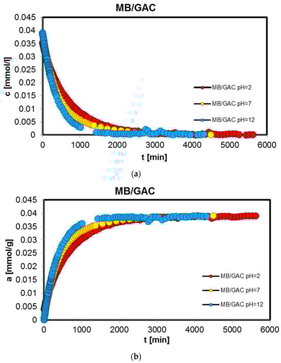 Comparison of the kinetics of adsorption of methylene blue (MB) on GAC activated carbon at different solution pH values presented in the profile of concentration changes over time (a), relative adsorption over time (b), and in Bangham’s linear coordinates (c).