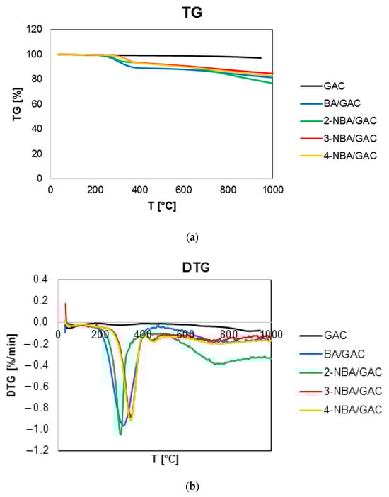 It should also be noted that the decomposition of the 2-NBA/GAC sample occurs already at 294.4 °C (DTG), while for 3-NBA/GAC and 4-NBA/GAC it occurs at 339.9 °C and 341.3 °C (DTG), respectively. Moreover, BA/GAC decomposition occurs at 299.4 °C (DTG). This indicates stronger interactions of 3- and 4-nitrobenzoic acids with GAC activated carbon in relation to other adsorbates. The weakest interaction in the 2-NBA/GAC system may result from the possibility of an intramolecular bond forming between the functional groups in the ortho position of 2-nitrobenzoic acid.