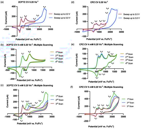 Cyclic voltammetry behaviour of 2CPTZ and CPZ, GCE (WE), Pt (CE), and Ag/AgCl (pseudo RE), referenced to Fc/Fc+. Electrolyte: TBAPF6; solvent: MeCN. (a) CV studies of 2CPTZ with multiple sweeps up to 2.0 V and 3.0 V, with a scan rate of 0.20 Vs−1. (b) Multiple-scan analysis of 2CPTZ (5 mM) sweeping up to 2.0 V. (c) Multiple-scan analysis of 2CPTZ (5 mM) sweeping up to 3.0 V. (d) CV studies of CPZ with multiple sweeps up to 2.0 V and 3.0 V, with a scan rate of 0.20 Vs−1. (e) Multiple-scan analysis of CPZ (4 mM) sweeping up to 2.0 V. (f) Multiple-scan analysis of CPZ (5 mM) sweeping up to 3.0 V.
