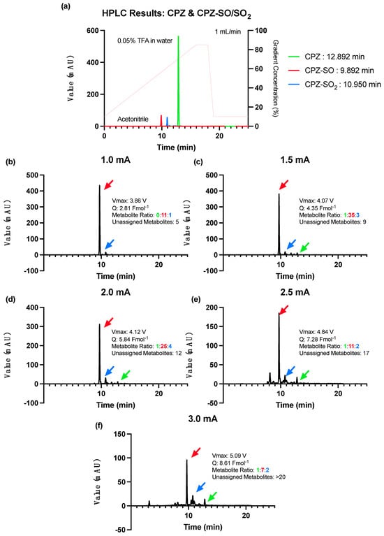 HPLC analysis of the CPZ metabolites’ electrosynthesis under different constant current conditions using ElectraSyn 2.0 at 25 °C for 24 h. (a) HPLC of the CPZ and CPZ-SO/SO2 with solvent gradient indicated in pink (acetonitrile and 0.05% TFA in water), (b) constant current of 1.0 mA, (c) constant current of 1.5 mA, (d) constant current of 2.0 mA, (e) constant current of 2.5 mA, and (f) constant current of 3.0 mA.