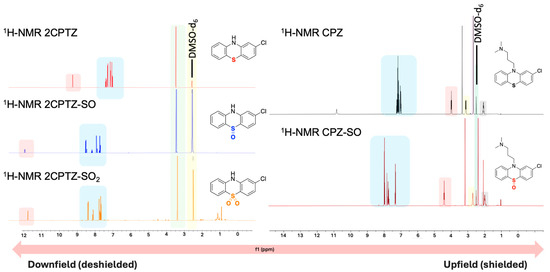 The stacked 1H-NMR spectra (400 MHz, DMSO-d6) of the PTZs studied and their respective metabolites synthesised via electrochemical oxidation.
