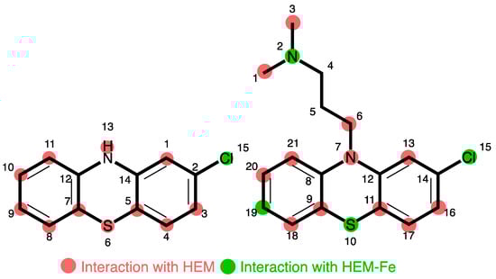 According to the docking results with CYP3A4 (Supplementary Materials), the sulfur atom of CPZ was observed to engage in a sulfur–ion pair interaction with heme-Fe at 3.0 Å (affinity energy: −7.45 kcal/mol), which would suggest that S-oxidation is a likely metabolic pathway with PTZs (Figure 6) [23].