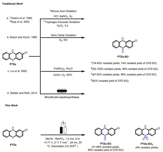 Previous approaches (a–d) [7,14,15,16,17] towards synthesising PTZs sulfoxide using chemical oxidants and microfluidic electrosynthesis and this work: a green electrosynthesis approach.