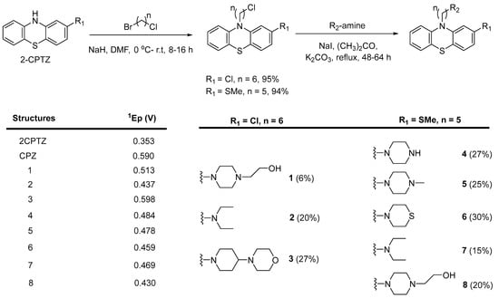 - Ohlow, M.J.; Moosmann, B. Phenothiazine: The Seven Lives of Pharmacology’s First Lead Structure. Drug Discov. Today 2011, 16, 119–131. [Google Scholar] [CrossRef] [PubMed]