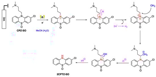 The oxidation process of PTZ occurred at the anode (working electrode), while the reduction process occurred at the cathode (counter-electrode) to maintain the balance of the oxidation reaction. One-electron oxidation of PTZ afforded a radical cation in non-anhydrous acetonitrile. Lee and coworkers presented a labelled control experiment in which water was the oxygen source in sulfoxide and sulfone formation [40], and water acted as a hydroxide source with hydrogen evolved at the cathode [41]. The hydroxide ions intercepted the S-centred radical cation, and the generated proton was reduced to produce hydrogen gas at the cathode. The presence of hydrogen gas can be inferred from pressure release upon opening the electrochemical vial cap. Further oxidation of the sulfoxide under analogous steps afforded the sulfone (Scheme 3). LCMS analysis was employed to identify other unpurified metabolites (Table 3). It was identified that one of the metabolites of CPZ is 2CPTZ-SO via an N-dealkylation reaction and sulfoxidation. A proposed mechanism of N-dealkylation is shown in Scheme 4.