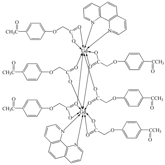 The infrared spectrum of the Gd(III) complex is shown in Figure 2. The characteristic bands of free 4-acetylphenoxyacetic acid (HL) are at ca. 1758 (ν(C=O)), 1648 (νas(COO−)), 1598 (νs(COO−)), and 1286 (ν(C=O)) cm−1, respectively [22]. In the Gd(III) complex, they appear at 1672, 1633, 1431, and 1253 cm−1. This shows that the carboxylate O atoms of the L ligand are involved in coordination with the Gd(III) ion. The band at 1599 cm−1 in the Gd(III) complex is assigned to ν(C=N) of the Phen ligand, indicating that the N atoms of the Phen ligand are also coordinated with the Gd(III) ion.