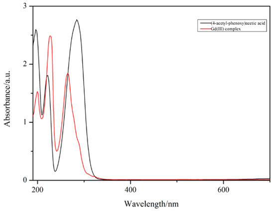 The UV–vis spectra of the Gd(III) complex and 4-acetylphenoxyacetic acid (HL) are illustrated in Figure 3. 4-acetylphenoxyacetic acid (HL) shows three absorption bands at 284, 221, and 196 nm, and the Gd(III) complex also shows three absorption bands at 265, 227, and 200 nm, which can be assigned to the π-π* transitions of the 4-acetylphenoxyacetate and Phen ligands. The absorption bands of the Phen ligand are at 323, 264, and 237 nm [32]; however, in the Gd(III) complex, the absorption band at 323 nm does not appear, indicating that the Phen ligand takes part in coordination with the Gd(III) ion.