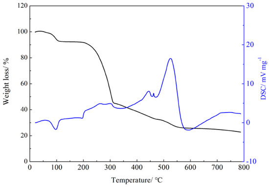 To investigate the thermal stability of the Gd(III) complex, the thermogravimetric analysis of the Gd(III) complex was performed at a heating rate of 5 °C/min in an air atmosphere using Al2O3 as a reference. The thermal stability curve of the Gd(III) complex is shown in Figure 4. The Gd(III) complex shows an endothermic peak at 98 °C, and the weight loss is 5.77% (calculated: 3.78%), which corresponds to the loss of four lattice water molecules. The Gd(III) complex shows three exothermic peaks at 195–325 °C, 423 °C, and 526 °C, indicating that the Gd(III) complex decomposes step by step and continues to lose weight by 80.2%, which corresponds to the decomposition of the 4-acetylphenoxyacetate ligands and Phen ligands.