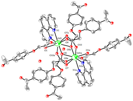 4-Acetylphenoxyacetic acid (0.0971 g, 0.5 mmol), NaOH (0.020 g, 0.5 mmol), and gadolinium(III) nitrate hexahydrate (0.1239 g, 0.3 mmol) were added to the ethanol–water (v:v = 1:2) solution (30 mL) with stirring. 1,10-Phenanthroline (0.0405 g, 0.25 mmol) was added to the above mixture after 30 min. The mixture was then stirred for 3 h at 80 °C and stirred continuously for 2 h at room temperature. The product was collected via filtration. The colorless block crystals of the Gd(III) complex were obtained from the filtrate after 35 days. The elemental analysis calculated for [Gd2(L)6(Phen)2]·4H2O was C, 52.88%, H, 4.09%, N, 2.94%; Found: C, 52.61%, H, 4.37%, and N, 2.72%.