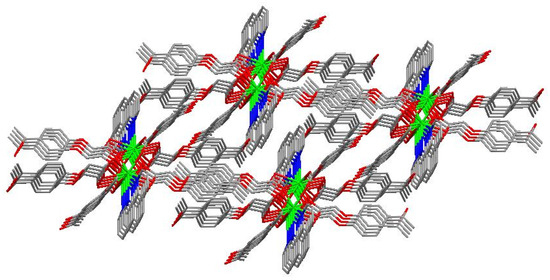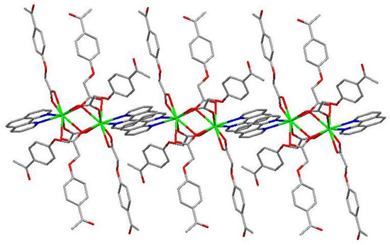 The molecular structure of the Gd(III) complex is shown in Figure 5. Important bond lengths (Å) and angles (°) for the Gd(III) complex are listed in Table 1. The one-dimensional chained structure is shown in Figure 6. The three-dimensional network structure is shown in Figure 7. The single-crystal X-ray diffraction analysis indicates that the structure of the Gd(III) complex is the same as the one we reported for the Yb(III) complex in the literature [22]. Furthermore, the title Gd(III) complex is binuclear according to the bridged oxygen atoms from the carboxylate groups with the Gd(III)-Gd(III) distance of 3.940 Å and crystallizes in the triclinic space group P-1. It can be seen from Figure 5 that the Gd(III) complex is made up of two Gd(III) ions, six 4-acetylphenoxyacetate ligands, two Phen ligands, and four lattice water molecules. Each Gd(III) ion is coordinated with three oxygen atoms (O7a, O8a, O8, or O7, O8a, and O8) from two bridged tridentate L ligands, two oxygen atoms (O9, O10a, or O9a, and O10) from two bridged bidentate L ligands, two oxygen atoms (O1, O2, or O1a, and O2a) from one bidentate L ligand, and two nitrogen atoms (N1, N2, or N1a, and N2a) from one 1,10-phenantroline co-ligand. This forms a nine-coordinated environment. The Gd1-O and Gd1-N bond lengths are in the range of 2.350(3)–2.548(3) Å and 2.545(4)–2.599(4) Å, respectively, which is similar to the corresponding bond lengths of those reported in the literature [23]. The O-Gd-O, O-Gd-N, and N-Gd-N bond angles lie in the range of 52.44(11)–148.81(11)°, 72.45(11)–148.26(12)°, and 63.96(12)°, respectively. The angles between the two Gd(III) ions with the two bridged oxygen atoms (Gd1-O8a-Gd1a or Gd1-O8-Gd1a) are 106.57°. The Gd(III) complex molecules form a one-dimensional chained structure (Figure 6) and a three-dimensional network structure via π-π stacking interactions (Figure 7 and Table 2). The π-π stacking interaction data of the Gd(III) complex is listed in Table 2.