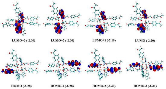 Electron density distributions and energy levels (eVs) of the frontier molecular orbitals for the Gd(III) complex (isovalue = 0.05 e·bohr−3).