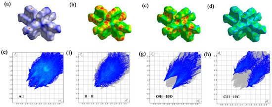 The Hirschfeld surface of the Gd(III) complex. the dnorm (a), di (b), de (c), and crystal’s roughness depicted in panels (d), all interactions (e), hydrogen–hydrogen (f), oxygen–hydrogen/hydrogen-oxygen (g), and carbon–hydrogen/hydrogen–carbon interactions (h).