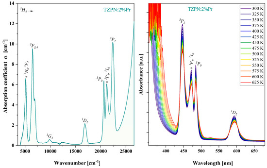 Absorption spectrum of oxyfluorotellurite glasses doped with 2%Pr (left). Impact of temperature, 300–625 K, on TZPN:2%Pr absorption spectra (right).