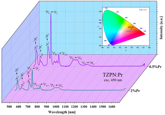 The results of the J-O theory analysis fully confirm the emission spectra recorded at room temperature for TZPN:0.5%Pr and TZPN:2%Pr glass samples. Typically, with 450 nm excitation, the Pr3+ ions from the 3H4 ground level are excited to a higher-energy 3P2 excited state but as a result of non-radiative relaxation, a transition to the lower excited energy level 3P0 occurs. The excitation wavelength 450 nm related to a prominent 3H4 → 3P2 absorption line was selected to avoid a potential effect of the competitive processes, which might be harmful for the desired praseodymium luminescence.