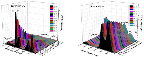 The influence of temperature on the emission spectrum of TZPN:0.5%Pr glass in the visible and near-infrared range was also examined (see Figure 4). The emission intensity of all bands decreases with increasing temperature but the spectral shape and peaks’ position are unaffected. The exception is that the band at 1327 nm corresponding to the 1G4 → 3H5 transition for that emission intensity diminishes with temperature increasing from 300 K to 600 K. The NIR luminescence at ~1.3 µm is widely used in telecommunications technology in the case of low-loss optical amplifiers operating in the O-band (1260–1360 nm) [48]. The attenuation of conventional O-band optical fiber is relatively large, for example, almost twice that of the C-band (1530–1565 nm) [49]. To compensate for this attenuation and effectively amplify light in the O-band, a praseodymium-doped fiber amplifier (PDFA) can be used based on a low-phonon-energy host glass and as one can see, the studied TZPN oxyfluorotellurite glass meets these requirements.