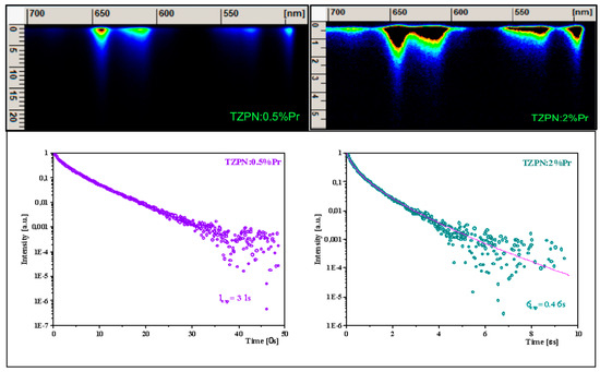Streak camera images related to praseodymium emission in TZPN:0.5%Pr and TZPN:2%Pr glasses (upper) and the adequate decay curves of 3P0 luminescence (bottom).