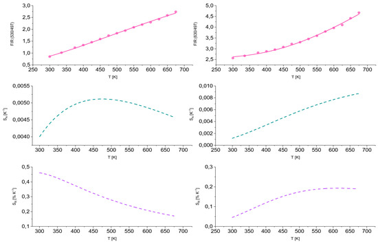 where ∆E is the energy difference between the thermalized levels, kB is the Boltzmann constant, T is the temperature expressed in the absolute scale [K] and A and B are constants. In the case of FIR (I530/I497), we observe a linear increase in the fluorescence intensity ratio with a maximum absolute temperature sensitivity value of SA = 5.1 × 10−3 K−1 at T = 460 K and approximately 0.46% K−1 relative temperature sensitivity for T = 300 K. The values of the fluorescence intensity ratios FIR (I630/I497) increase exponentially with temperature and the maximum absolute temperature sensitivity is reached for T = 675 K and amounted to 8.7 × 10−3 K−1, which translates into SR = 0.20% K−1 of relative temperature sensitivity at about T = 460 K. All absolute and relative curves of temperature sensitivity for TZPN:0.5%Pr glass have a non-linear way with a different tendency. For a comparison, A.S. Rao examined the impact of temperature on four different emission bands of praseodymium [56]. Some fluorescence intensity ratio (FIR) models based on the relationships between different emission peaks were studied to estimate a maximum relative sensitivity, 1.03% K−1. Moreover, other Pr-doped inorganic phosphors were investigated by Jiawen Wang et al. [57] and a comparable evaluation approach gave rise to quite high relative sensitivity (1~3.25% K−1) and low temperature uncertainty (0.15–0.5 K). These reported sensitivities are higher in relation to TZPN:Pr estimations but regardless, our results are attributed to a wide temperature range up to 675 K.
