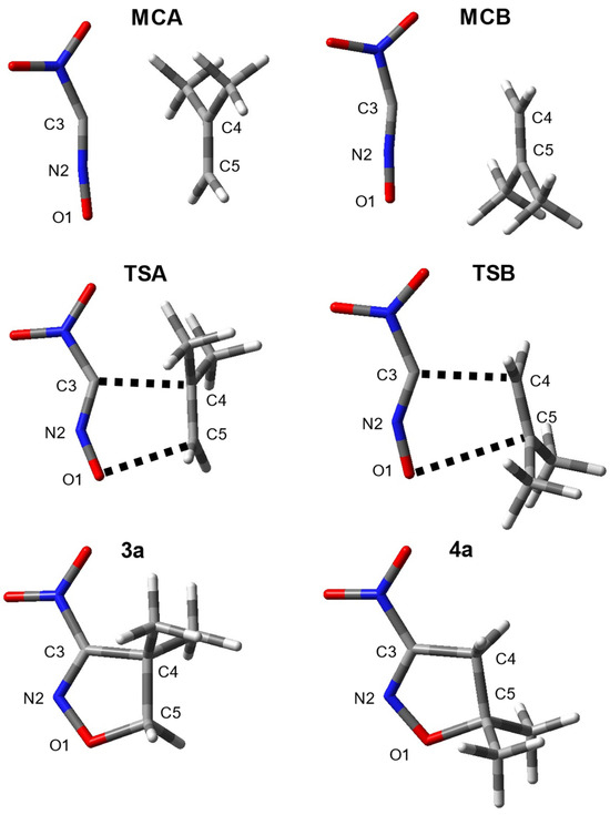 In the initial phase of the reaction progress, respective pre-reaction molecular complexes are formed in the case of both 32CA pathways (MCA and MCB for paths A and B, respectively). The reduction in enthalpy of the molecular system by about 2.3–2.5 kcal/mol is a result of this transformation (Table 2, Figure 1). At the same time, however, the entropy of the molecular system is substantially reduced. As a result, the Gibbs free energies of formation for both MCs are positive. This excludes the possibility of the existence of MCA and MCB complexes as thermodynamically stable intermediates. Within the MC, substructures of addends adopt orientations that stimulate maximum stable coulombic interactions. Any new sigma bond, however, are not created at this stage. The key interatomic distances are beyond the range typical for C-C and O-C bonds formed in the transition state (Table 3, Figure 1). Additionally, the electron density transfer between substructures is not observed. Thus, the detected structures cannot be considered as charge–transfer complexes [78,79]. Similar intermediates were recently detected in many 32CAs involving different types of TACs [80,81].