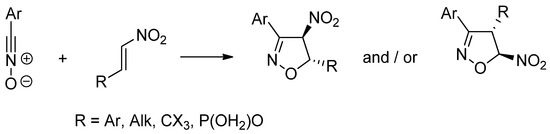 An effective way for the preparation of 4-nitro- and 5-nitro-2-isoxazoline molecular segments is the [3+2] cycloaddition reactions involving nitrile N-oxides and conjugated nitroalkenes [23,24,25,26]. Necessary nitroalkenes can be easily obtained from respective nitroalkanes and carbonyl compounds via the Henry reaction and further elimination of water molecules [27,28]. On the other hand, alkyl—or aryl nitrile N-oxides—can be prepared from commercially available aldehydes via the oxime formation and further halogenation/dehydrohalogenation sequence [29,30,31,32]. Consequently, a large number of effective protocols for the synthesis of 4 and 5-nitroisoxazolines is available in the current literature (Scheme 1).