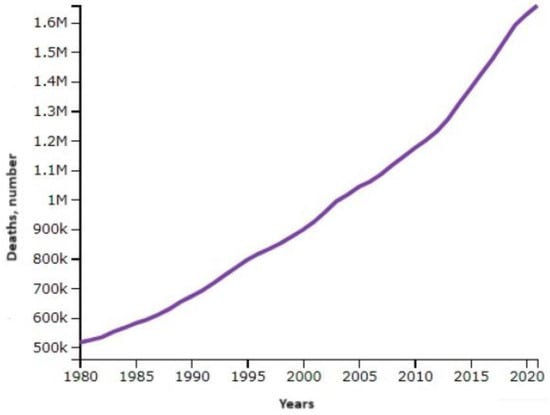 Diabetes mellitus is an endocrine chronic disease characterized by high sugar levels in the blood. It occurs when the pancreas does not produce enough insulin or when the organism has insulin resistance [1]. The common symptoms of diabetes are thirst, polyuria, weight loss, blurred vision, hunger, numb or tingling hands or feet, fatigue, dry skin, sores that heal slowly, nausea, vomiting, or stomach pains. Type 1 diabetes symptoms can develop precipitously in a few weeks or months. It most often occurs at an early age. Type 2 diabetes develops slowly over several years and usually occurs in adults [1]. A total of 8.5% of the persons who were 18 years of age and older had diabetes in 2014. A total of 1.5 million deaths were directly related to diabetes in 2019, and 48% of these deaths occurred in those under the age of 70. Diabetes contributed to an additional 460,000 renal disease fatalities, and elevated blood glucose is responsible for almost 20% of the cardiovascular mortality [2]. Age-standardized diabetes mortality rates increased by 3% between 2000 and 2019. Diabetes-related death rates rose by 13% in lower-middle-income nations. In contrast, between 2000 and 2021, there was a 22% global decline in the likelihood of dying from any of the four major noncommunicable diseases (cancer, chronic respiratory diseases, diabetes, or cardiovascular diseases) between the ages of 30 and 70 (Figure 1) [2].