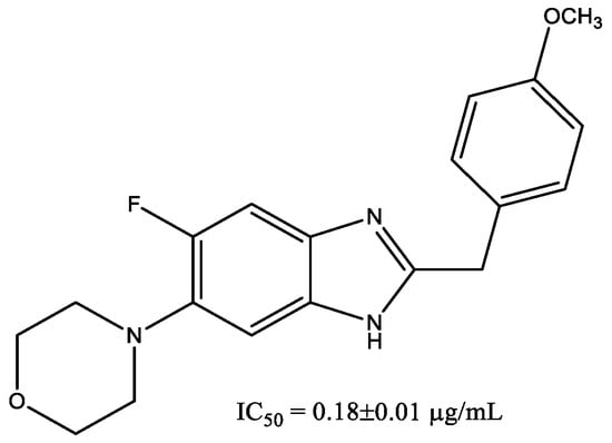 The series of 4-(5-fluoro-2-substituted-1H-benzimidazol-6-yl)morpholine derivatives showed remarkable α-glucosidase inhibitory potentials [19]. A compound shown in Figure 8, which has a methoxy group on the phenyl ring, was found to be the most active molecule of the series. It was observed from in vitro and in silico studies that electron-donating groups such as methyl and methoxy on phenyl ring and increased conjugative effect played a significant role in the inhibition, which could be a promising lead for future investigation.