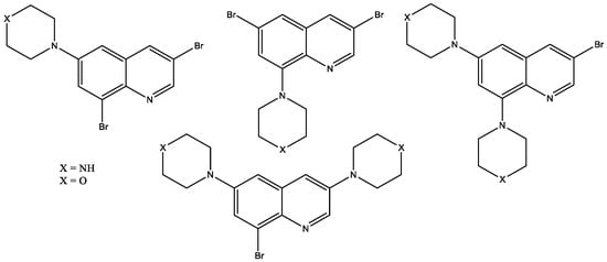- Çakmak, O.; Ökten, S.; Alımlı, D.; Ersanlı, C.C.; Taslimi, P.; Koçyiğit, Ü.M. Novel Piperazine and Morpholine Substituted Quinolines: Selective Synthesis through Activation of 3,6,8-Tribromoquinoline, Characterization and Their Some Metabolic Enzymes Inhibition Potentials. J. Mol. Struct. 2020, 1220, 128666. [Google Scholar] [CrossRef]