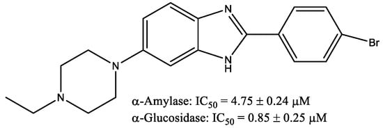 Novel 6-(4-substitue-piperazin-1-yl)-2-aryl-1H-benzimidazole derivatives starting from 5-(4-substitue-piperazin-1-yl)-2-nitroaniline with different aldehydes (example compound is showed in Figure 19) showed within in vitro evaluations α-amylase and α-glucosidase inhibitory activities, as well as their antioxidant properties (DPPH radical scavenging capabilities) [32]. The results demonstrated that all the synthesized analogs exhibited the significant inhibition of both α-glucosidase and α-amylase potential between IC50 = 0.85 ± 0.25–29.72 ± 0.17 µM and IC50 = 4.75 ± 0.24–40.24 ± 0.10 µM, respectively, in comparison to the standard acarbose (IC50 = 14.70 ± 0.11 μM).