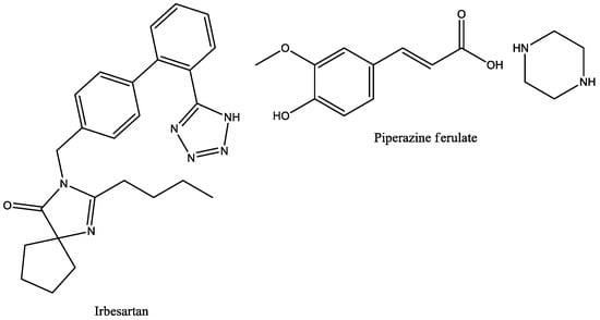 Structural formulae of irbesartan and piperazine ferulate (PF).