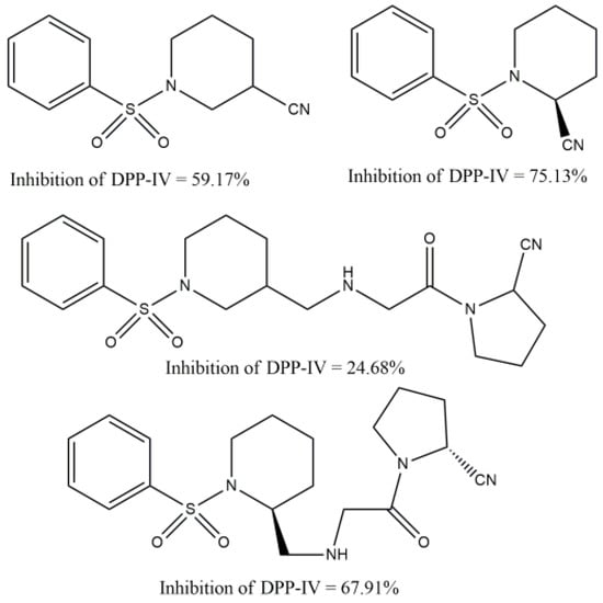 The study [41] of the sulfonamide derivatives of piperidine (Figure 27) showed that the presence of nitrile group gives to compounds DPP-4 inhibition. The sulfonamide derivatives of piperidine-3-carbonitrile and pyrrolidine-2-carbonitrile showed great activity comparable with the standard drug Vildagliptin via in silico and in vitro studies.