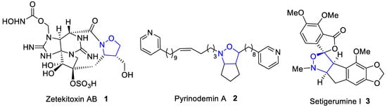 Among various heterocyclic systems, isoxazolidine derivatives have numerous applications in organic synthesis and medicinal chemistry [1]. Compounds functionalized with an isoxazolidine moiety show a broad spectrum of biological activity, e.g., anticancer [2,3,4,5,6,7,8,9,10,11,12,13,14,15], antifungal [16,17,18], antibacterial [17,18,19,20,21], antiviral [2,10,22,23,24], antioxidant [25,26], anti-inflammatory [27], and antidiabetic [28,29]. Additionally, the isoxazolidine ring occurs in the structure of several alkaloids, e.g., 1–3 (Figure 1) isolated from various species of plants, aquatic invertebrates, and amphibians [30,31,32,33]. Among them, zetekitoxin AB (1) was found to be a potent blocker of voltage-dependent sodium channels expressed in Xenopus oocytes [30,31], while pyrinodemin A (2) isolated from the sea sponge Amphimedon was cytotoxic towards the murine leukemia cell line (L1210) (IC50 = 0.058 µg/mL) and the epidermoid carcinoma cell line (KB) (IC50 = 0.5 µg/mL) [32]. Although the biological activity of the trace racemic alkaloid Setigerumine I (3) naturally occurring in Papaveraceae family plants has not yet been investigated, studies on its biosynthetic availability have been undertaken [33].