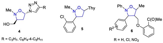 The idea of the replacement of an isoxazolidine moiety by a furanose ring in nucleosides was first described by Tronchet and co-workers [34]. It resulted in the discovery of several isoxazolidine analogs of nucleosides and nucleotides exhibiting anticancer activity (Figure 2 and Figure 3). Cytotoxic activity of 1,2,3-triazole-isoxazolidine hybrids 4 (Figure 2) towards thyroid cancer cell lines (FTC-133) (IC50 = 3.87–3.95 µM) was recognized [4]. Compound 5 (Figure 2) showed an antitumor effect against the Jurkat cell line (IC50 = 8.8 ± 4.4 µM) [5]. Inhibitory properties of N-phenylisoxazolidines 6 (Figure 2) against colorectal adenoma cancer cell line growth (HT-29) (GI = 42–57%) were higher than those for the known anticancer drugs Mitomycin C (GI = 31%) and 5-Fluorouracil (GI = 34%), while the activity of 6 towards the breast cancer cell line was found to be (MCF-7) (GI = 26%), comparable to 5-Fluorouracil (GI = 31%) [6].