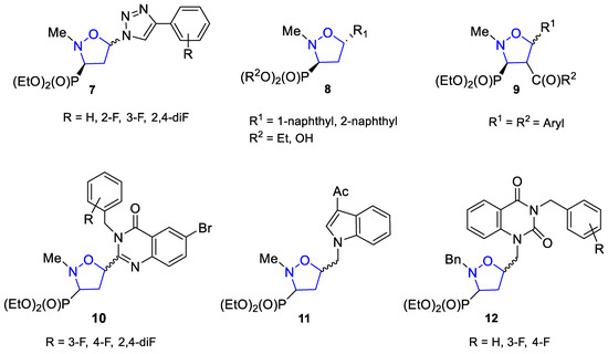 Among isoxazolidine analogs of nucleotides, compounds of general formula 7 (Figure 3) revealed cytotoxic activity against the human lung fibroblast cell line (HEL) (IC50 = 40.0–43.0 µM) [7]. 5-Naphthylisoxazolidines 8 (Figure 3) induced apoptosis in the HeLa and K562 cell lines with IC50 values of 0.05–0.2 mM and 0.03–0.2 mM for the HeLa and K562 cell lines, respectively [8]. A similar cytotoxicity of 3-(diethoxyphosphoryl)isoxazolidines 9 (Figure 3) towards K562 was also observed (IC50 = 0.07–0.09 mM) [9]. On the other hand, C-nucleotides 10 (Figure 3) exhibited anticancer activity against the human lymphocyte cell line (CEM) (IC50 = 9.6 ± 2.2–10.0 ± 0 µM), higher than 5-Fluorouracil used as the reference drug (IC50 = 18.0 ± 5.0 µM) [10]. Homonucleotides 11 and 12 (Figure 3) containing a methylene group incorporated between a modified nucleobase and isoxazolidine ring were found to be active anticancer compounds. Isoxazolidines 11 inhibited the proliferation of the murine leukemia cell line (L1210) at an IC50 = 33 ± 3.5 µM [3], whereas nucleotides 12 with a functionalized quinazoline-2,4-dione moiety as a false nucleobase were cytotoxic towards the CEM cell line (IC50 = 10.0 ± 6.0–17.0 ± 3.0 µM) [2].