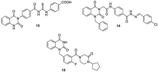 Incorporation of the quinazoline-2,4-dione motif into the structure of compounds with the desired pharmacological effect is fully justified by the current knowledge about a wide range of biological functions of various derivatives within this class of compounds [35]. Taking into account the intention to achieve an optimal cytotoxic effect on cancer cells, several quinazoline-2,4-dione derivatives with well-documented anticancer properties should be mentioned [36,37,38]. And thus, 13 (Figure 4) exhibited promising cytotoxic activity against HCT-116 (IC50 = 1.184 ± 0.06 µM) and was found to be more active than the cabozantinib used as the positive control (IC50 = 16.35 ± 0.86 µM) [36]. While derivative 14 functionalized at both the N1 and N3 position of quinazoline-2,4-dione (Figure 4) showed significant antiproliferative activities against three cancer cell lines, namely, HepG2, HCT-116, and MCF-7 (GI50 = 9.16 ± 0.8, 5.69 ± 0.4, and 5.27 ± 0.2 µM, respectively) [37], the N1-monosubstituted quinazoline-2,4-dione 15 (Figure 4) inhibited both PARP1 and 2 (poly(ADP-ribose)polymerase 1 and 2) [38].