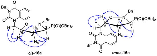The relative configurations of cis- and trans-isoxazolidines 16a–g were assigned based on 2D NOE experiments performed for cis-16a and trans-16a (Figure 5). For the isoxazolidine cis-16a, in addition to the expected NOESY signals between HC5 and both protons at H2C4 and H2C protons attached to the quinazoline-2,4-dione unit, a diagnostic signal between HC5 and HC3 was observed, which unequivocally proves the cis orientation of the substituents at C3 and C5. On the other hand, since the correlation between HC5 and HC3 was not observed in the NOESY spectrum taken for trans-16a, trans orientation between the substituents at C3 and C5 was deduced for this diastereoisomer. A slight modification of the substituents at N3 of the quinazoline-2,4-dione moiety has no influence on the stereochemical outcome of the cycloaddition; therefore, the configuration of all major isoxazolidines 16 was assigned as trans, whereas minor ones were identified as respective cis-isomers.