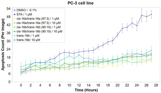 Apoptosis induction tests were conducted using the IncuCyte system to test cells (PC-3) in an in vitro culture. Analysis was performed for the isoxazolidines or respective mixtures of diastereoisomers, i.e., cis-16a/trans-16a (97:3), cis-16b/trans-16b (90:10), and trans-16b exhibiting the highest antiproliferative properties. The compounds were tested at 1 µM and 10 µM concentrations, and apoptosis was monitored for 28 h (Figure 6). The incubation time was selected based on the induction of apoptosis in the control cells. Staurosporine (STA) at a concentration of 1 µM was used as the positive control, while the negative control cells were treated with 0.1% DMSO (vehicle control). The most active compound was trans-16b at 10 μM. As shown in Figure 6, apoptosis induction was most pronounced up to 12 h and was comparable to that induced with staurosporine.
