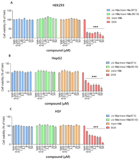 The cytotoxicity effect of cis-16a/trans-16a (97:3), cis-16b/trans-16b (90:10), trans-16b, and doxorubicin (DOX) on HEK293 (A), HepG2 (B), and HSF (C) cells after 72 h. Each point represents the mean ± SEM of three independent experiments, each consisting of four replicates per treatment group (n = 12). Statistical analyses were performed using GraphPad Prism 8.0 software. Statistical significance was evaluated by one-way ANOVA with post hoc Dunnett test at significance level α = 0.05 (*** p < 0.001).