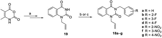 Reaction and conditions: (a) details for the preparation of N1-allylquinazoline-2,4-dione 19 given in [2]; (b) respective benzyl bromide KOH, MeCN, reflux, 4h for the synthesis of 18a–d [2]; (c) respective nitrobenzyl bromide, K2CO3, DMF, rt. 72 h, for the synthesis of 18e–g.