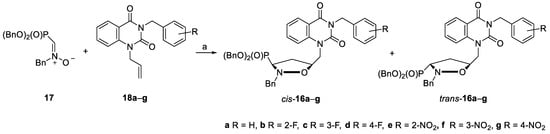 The cis and trans compounds 16a–g were efficiently synthesized from N-benzyl-C-(dibenzyloxyphosphoryl)nitrone 17 and selected N1-allyl-N3-benzylquinazoline-2,4-diones 18a–g with good yields (61–69%) and low to moderate diastereoselectivities (d.e. 16–34%). The relative configurations in the (isoxazolidine)phosphonates cis-16a–g and trans-16a–g were established based on the analysis of the 2D NOE experiments performed for cis-16a and trans-16a.